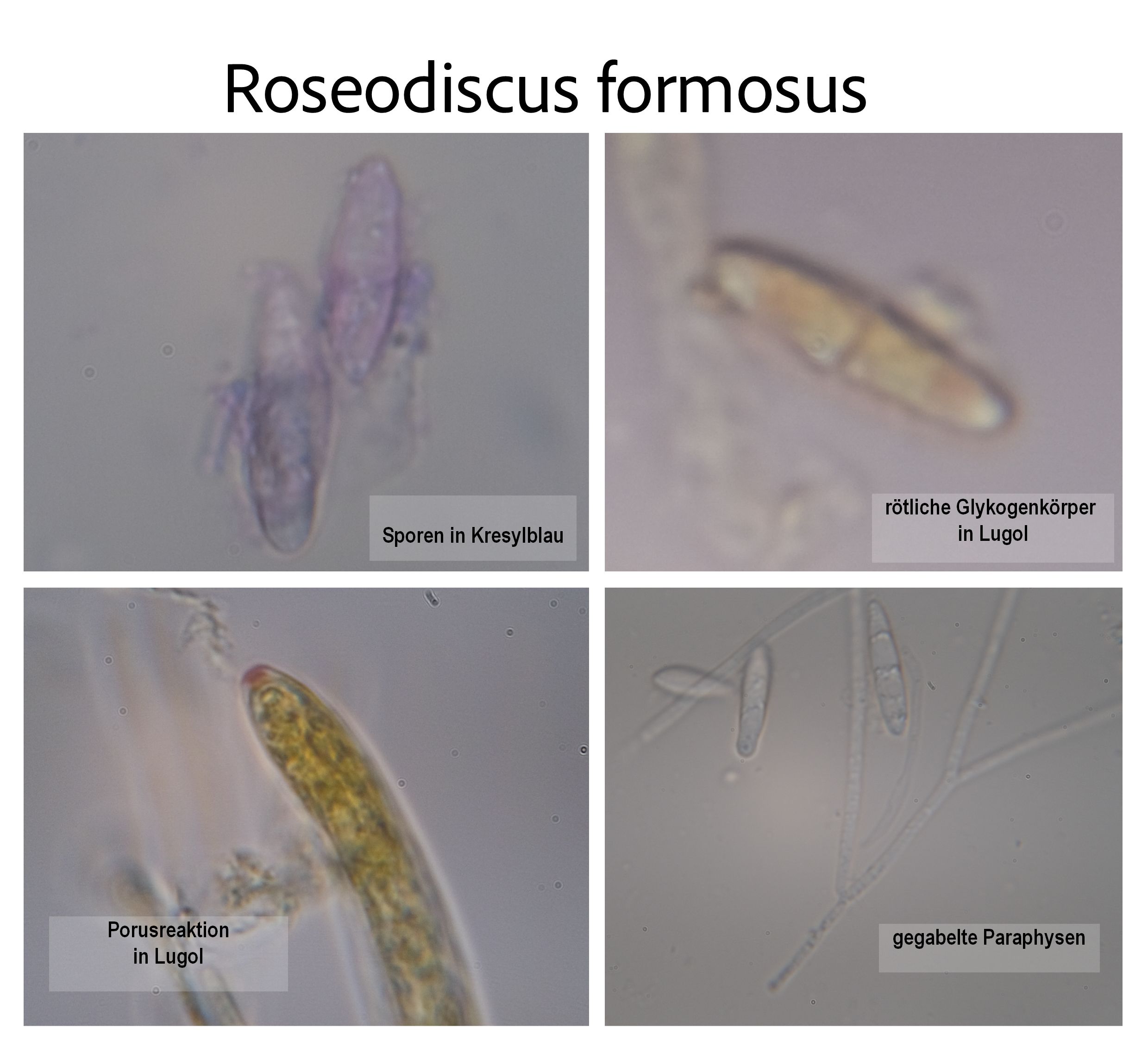 Die Gattung Roseodiscus besitzt lediglich 5 Arten: der hier gezeigte Roseodiscus formosus, Roseodiscus rhodoleucus, Roseodiscus equisetinus, Roseodiscus sinicus und Roseodiscus subcarneus. R. rhodoleucus und R. equisetinus sind auf Equisetum (Schachtelhalme) spezialisiert, R. sinicus wächst auf Resten von Monokotyledonen, also einkeimblättrigen Pflanzen. Auf Moosen wachsen nur R. formosus und R. subcarneus. Von R. subcarneus unterscheidet sich R. formosus durch kräftigere turbinate Apothecien, Rötende statt blauende (euamyloide) Apikalringe in Lugol, kleiner Asci und kleinere Sporen.