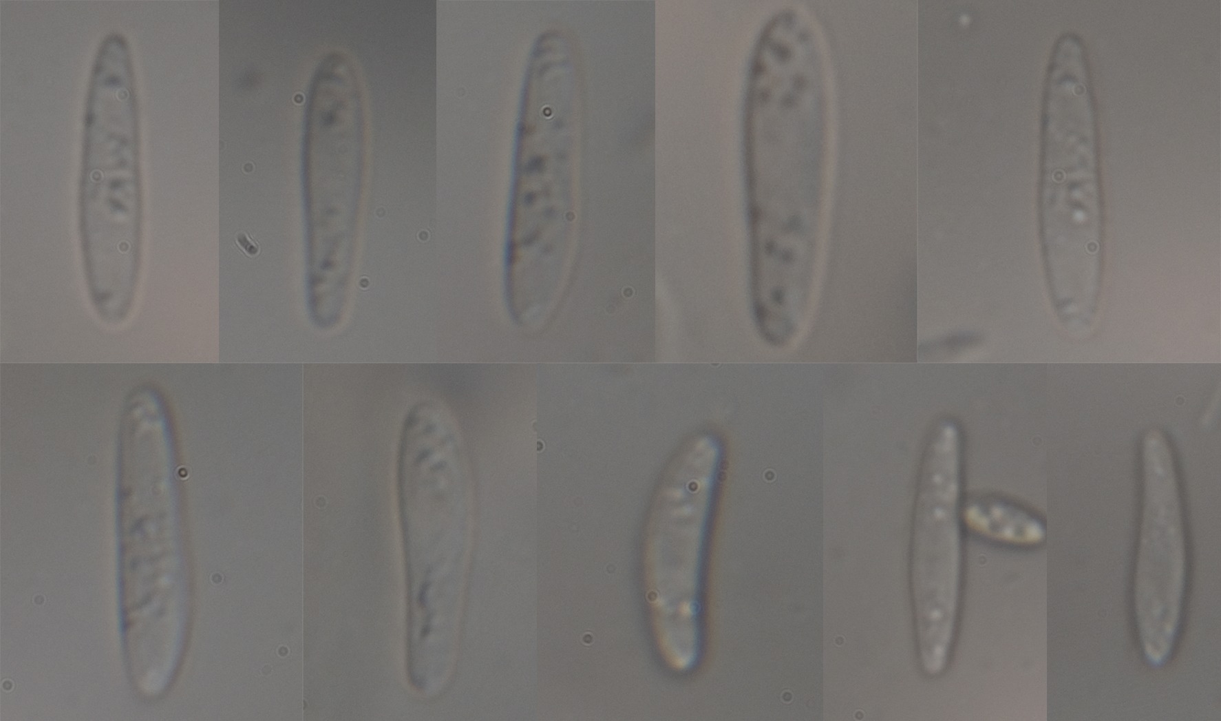 Sporen: ellipsoid bis keulig, „fichtenzapfenförmig“, manchmal mit Septe und mit einer schwachen Schleimhülle welche in Kresylblau anfärbbar ist, Ölgehalt 2-3 mit in Lugol erkennbaren Glykogenkörpern